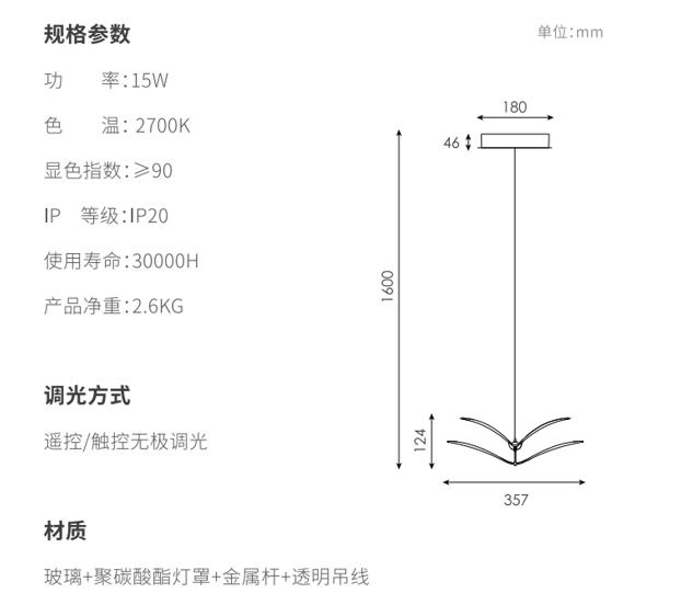 如翼吊灯用双层弯曲的造型作为主要造型特征形成在空间里自由灵动的造型,,以一定的角度倾斜,,,形成丰富的画面,,,,两翼的线条均为精心设计,,,,精准控制光线的传播,,将直下光和漫反射光结合,,,70%灯光向下,,30%灯光向上,,,在空间里形成舒适的光学效果,,下灯罩为片状玻璃印刷专门调制的乳白色油墨,,热弯成对应弧度,,,,灯光透过灯罩呈现出更加柔和的视觉效果;边缘特意留有5mm宽度透明环,,使视觉更精致轻巧;灯罩利用两个金属“领夹”式的杆连接固定,,整体视觉优雅;